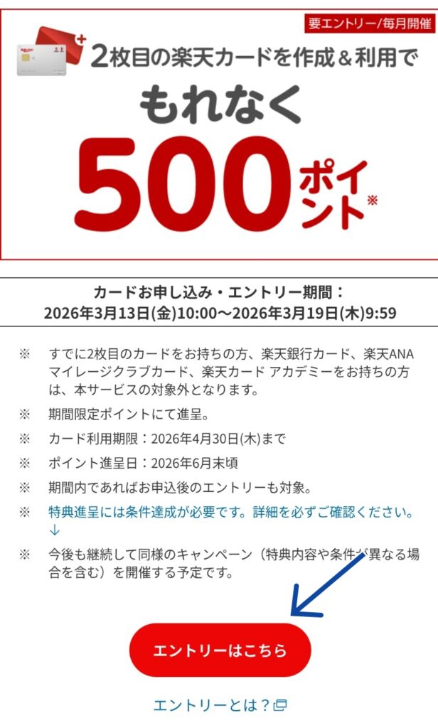 楽天e-NAVIのキャンペーンページを開き、「2枚目作成・利用」のキャンペーンに必ずエントリーします。※これを忘れると数千ポイント損をします。