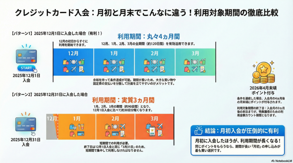 10万ポイント獲得の条件となる「3カ月100万円利用」。月平均33万円の決済ですが、実は「申し込みのタイミング」次第で、さらに心理的ハードルを下げることができます。